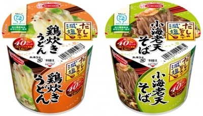 3. 配布商品 : 「かるしお認定 だしの旨みで減塩」シリーズ「鶏炊きうどん」、「小海老天そば」