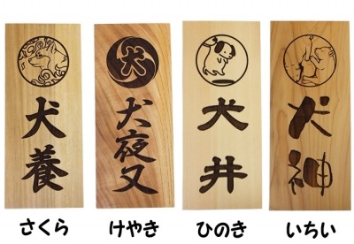 「いぬもん表札」は、犬と一緒に暮らす証としてオリジナルデザインの犬家紋を彫った木製表札です。