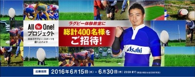 アサヒビール株式会社(本社 東京、社長 平野伸一)は、パートナーシップ契約を締結しているプロラグビープレイヤー五郎丸選手と共同で、「五郎丸 歩×アサヒビール All for One! プロジェクト『ラグビー体験教室』」(以後、「ラグビー体験教室」)を2016年7月25日(水)と、8月2日(火)に開催します。応募受付については、6月15日(水)より開始します。