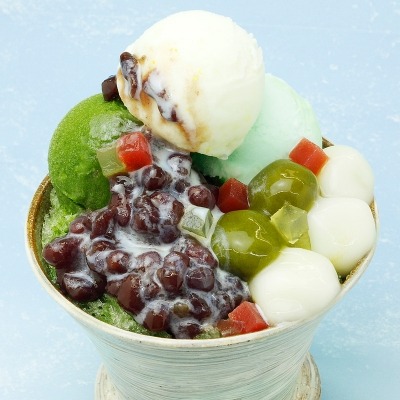 宇治抹茶のかき氷に、三種のアイス(抹茶シャーベット・ゆずシャーベット・塩アイス)を載せ、さらに白玉、小豆、いちごとゆずのグミを盛りつけたボリューム満点の一品です。
