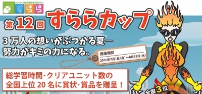 株式会社すららネット(本社:東京都千代田区、代表取締役社長:湯野川孝彦)では、クラウド型学習システム「すらら」の利用者が努力量を競う大会「すららカップ」を201年7月1日(金)より8月31日(水)まで開催いたします。