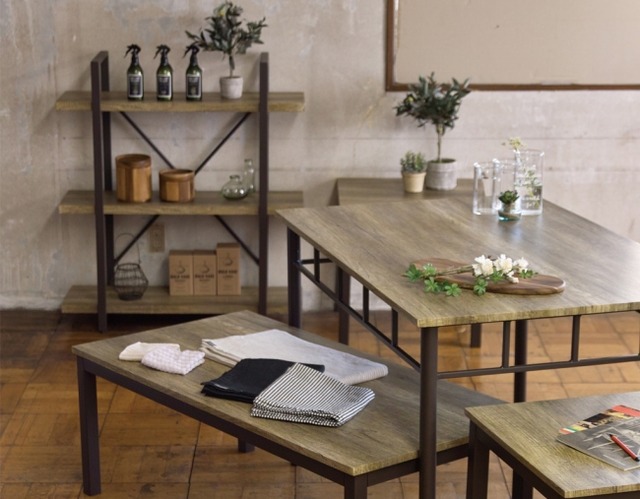 きたような古木調のデザインとブラックアイアンを組み合わせたテーブルや棚が登場しました!