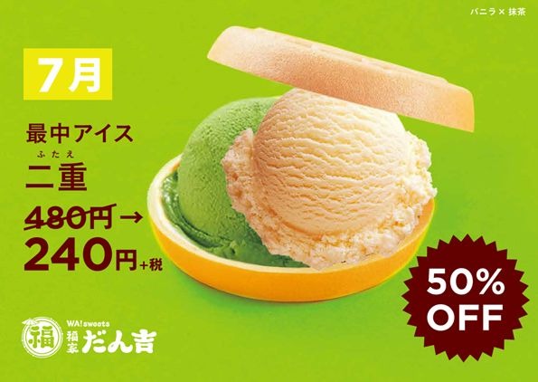 最中アイス「二重」が期間中、480円+税の価格が50%引きで240円+税となります。