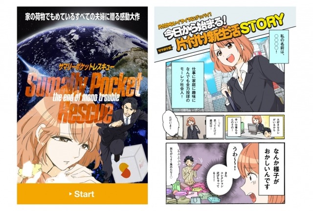 仲良しだった結婚当初を思い出しながら現状に悩む主人公は、あるとき、なんでも完璧にこなす憧れの先輩から「サマリーポケット」という収納サービスを勧められ、今後の夫婦生活に関わる選択の時を迎えます。選択によっては綺麗な奥さんとの絶好調な夫婦生活を取り戻すことも、地球が爆発することも?!夫婦間での、モノを「捨てたい」「捨てられない」のトラブルを解決すべく、自分が物語の主人公になって疑似体験できることが特徴のオリジナルマンガです。