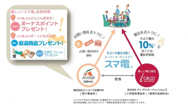 株式会社アイ・グリッド・ソリューションズ(本社:東京都千代田区、代表取締役社長:本多聰介)と株式会社エーコープ京都中央(本部:京都府京都市、代表取締役:宮田貴之)は、スーパーマーケットで買える電気のブランド「スマ電(R)」を7月1日(金)より、岩倉店・市原野店の2店舗にて販売します。