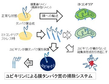 (ユビキリンはミトコンドリア膜タンパク質を識別保護し、分解へ導く)