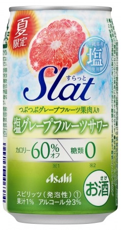 「アサヒSlat(すらっと)」の夏の期間限定フレーバーは、沖縄県産の塩を使用し、塩のまろやかさと果実の爽やかな酸味や甘味のバランスのとれた缶チューハイです。すっきりとした後味で、それぞれレモン果肉とグレープフルーツ果肉のつぶつぶ食感も楽しめます。適度な塩味で味わいにコクを加え、まろやかな飲み口に仕上げました。