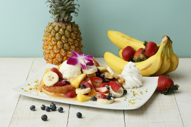 苺、バナナ、パイナップル、ブルーベリーなどのフルーツと生クリームたっぷりの色鮮やかなハワイアンパンケーキ。南国グァバソースとの相性は抜群!