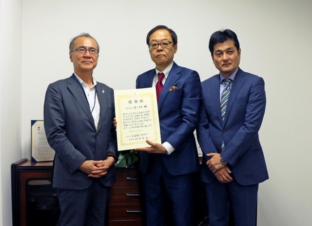感謝状はコックスにて、同NPOの松井秀文理事長から(株)コックス代表取締役社長吉竹へ手渡されました。松井理事長は、当社のこれまでの活動に対し「これまでの取組みに感謝申し上げます。小児がん患児やご家族が抱える問題は多岐にわたっており、引き続きご支援をお願いします」と述べられました。