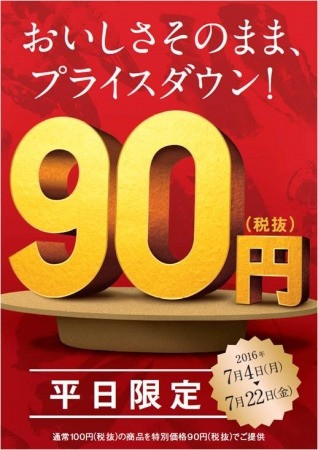 本企画では、山形県、岩手県、福島県、秋田県、広島県、山口県の6県54店舗を追加し「平日一皿90円キャンペーン」(*)を2016年7月4日(月)から7月22日(金)の期間で開催。対象店舗にて通常一皿108円(税込)の商品を一日中、特別価格である97円(税込)で提供いたします。