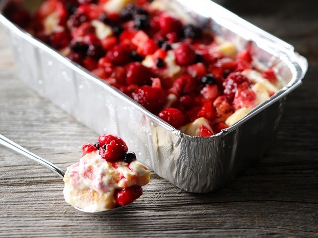 フレンチトーストを食べやすい大きさにカットし、チーズプディングと一緒に容器に詰め、たっぷりのベリーを飾りました。プリンと絡まったフレンチトーストのなめらかな美味しさをお楽しみください。