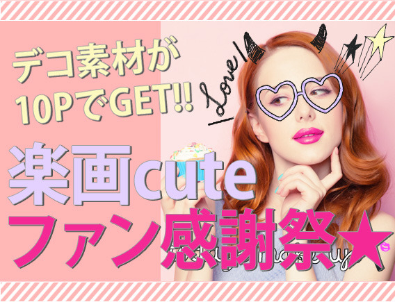 『楽画cute』アプリ内でポイント(※)を貯めることによって入手できる『デコ素材』。通常『デコ素材』を入手する為には100ポイント使用の必要であった所『感謝祭』期間中はデコ素材(※)を90%オフの10ポイントで入手することのできる非常にお得なイベントキャンペーンとなっております。(http://rakugacute.pfeel.jp/rakugacute/wp/?p=372)