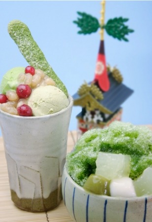 京の一大イベント祇園祭にちなんで、鉾に見立てたパフェと、山に見立てた抹茶かき氷をセットにした、祇園本店限定のメニューです。