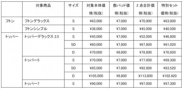 対象商品の「テンピュール(R) フトン」は、テンピュール(R)の寝ごこちやサポートはそのままに、日本の空間、環境に合わせて開発された薄型マットレス。畳やフローリングで自由に使うことができ、さらに、折りたたんで収納できるなど、日本の住環境に適した仕様になっており、発売以来大きな人気を誇る商品です。ボリュームのあるデラックスな寝ごこちの「フトンデラックス」、スリムで折りたたみやすいデザインの「フトンシンプル」の2種類からお選びいただけます。