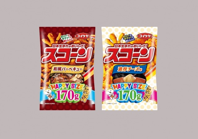 パッケージに配置された“HAPPY SIZE”の文字通り、みんなが笑顔になれる当社の通常サイズ(80g)と比較して2倍を超える大容量の「スコーン」です。定番の「和風バーベキュー」と「濃厚チーズ味」の2つの味は人が集まる機会の“おやつ”としても“おつまみ”としても大活躍すること間違いなし。今夏、期間限定で登場する“HAPPY SIZE”の育む“HAPPY TIME”をお見逃しなく、お楽しみください。
