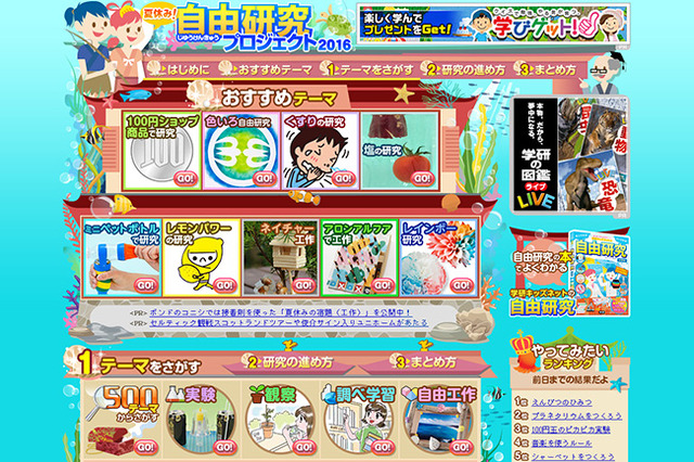 株式会社学研ホールディングス(東京・品川 代表取締役社長:宮原博昭)のグループ会社、株式会社学研プラス(東京・品川 代表取締役社長:碇秀行)では、2016年7月1日よりWebサイト『夏休み自由研究プロジェクト2016』をオープンいたしました。