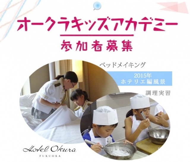 ホテルオークラ福岡(福岡市博多区、代表取締役社長 水嶋 修三)では、未来を担う子供たちの心身の成長をお手伝いすることを目的とした「オークラキッズアカデミー」を2016年8月に開催します。ベル係体験や、ベッドメイキング、調理実習に加えて、和食のテーブルマナー研修を取り入れ、和の作法も学べる「ホテリエ編」と、味覚やマナーについて学ぶ「味覚のクラス編」で参加者募集を開始しました。