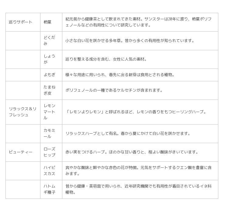 1. こだわりの国産柿葉をメインに、どくだみ、しょうが、よもぎ、たまねぎ皮を「巡りサポート」、レモンマートル、カモミールを「リラックス&リフレッシュ」、ローズヒップ、ハイビスカス、ハトムギ種子を「ビューティー」素材として10種を厳選配合。