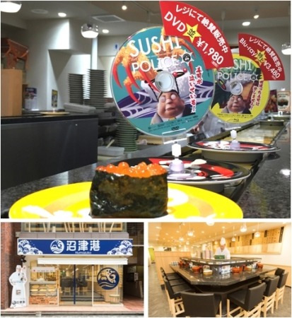 海外でも話題の「SUSHI POLICE」と外国人旅行者の間でも高い人気と支持を得ている回転寿司 沼津港は、これまで寿司を通して様々なコラボレーションを展開してきました。今回、沼津港新宿本店でDVD・Blu-rayを先行販売するにあたり、回転寿司レーン上を寿司とともにDVD・Blu-rayが廻るという、前代未聞の販売方法を試みます。寿司を追いかけるように廻る「SUSHI POLICE」のDVD・Blu-rayを是非店頭でお手にとってご覧ください。