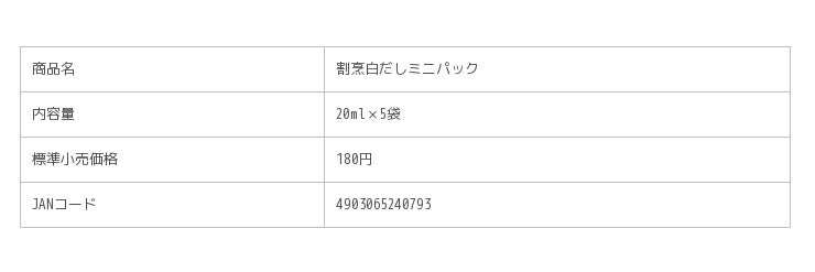 『割烹白だしミニパック』は、1袋20mlの使い切りサイズのミニパックが5袋入っていますので、使い残しを気にせずに手軽にご使用いただけます。また計量する手間を省き、1人前量はスープ・炒め物は1袋、煮物は2袋で作れるよう身近なメニューの作り方をパッケージ裏面に掲載しています。割烹白だしを初めて使う方や慣れていないお客様でも簡単に調理できる仕様にしました。鰹節屋・だし屋のヤマキの自信作をご賞味ください。