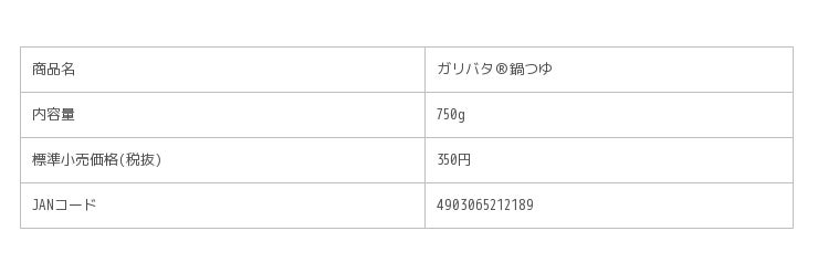 「ガリバタ(R)鍋つゆ」は、鶏と豚骨のWスープにガーリックの風味とバターのコクを効かせ、ごま油を加えた食欲をそそる味わいの鍋つゆです。豚バラ肉やエリンギ、キャベツなどのボリュームのある具材と相性がよく、白湯仕立てのWスープのうま味で野菜もたくさん食べられますので、お子様から大人までご家族みんなでお楽しみいただけます。