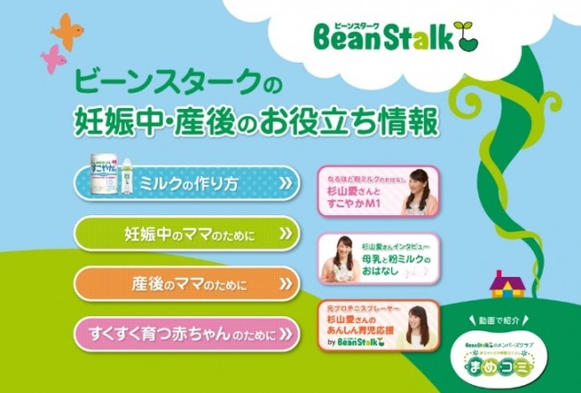 まめコミサイトは雪印ビーンスタークが運営するママ向けの情報サイトです。雪印ビーンスタークの母乳研究から完成した母乳絵本や、離乳食レシピ、粉ミルクについてさまざまな育児に関する情報を掲載しております。またママに必要な予防接種スケジュール管理など、便利アイテムも多数ございます。今回iPadと連動した「ビーンスタークの妊娠中・産後のお役立ち情報」がコンテンツとして加わりましたので是非ご活用ください。