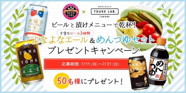 今回は、『TSUKE LAB.(つけラボ)』が、ビールのあるライフスタイルを提案している『ビール女子』とコラボして、ビールに合う漬けメニューを手軽に楽しめるヤマキ「めんつゆ」と、人気のクラフトビール「よなよなエール」を含む3種類のビールを抽選で50名様にプレゼントします。