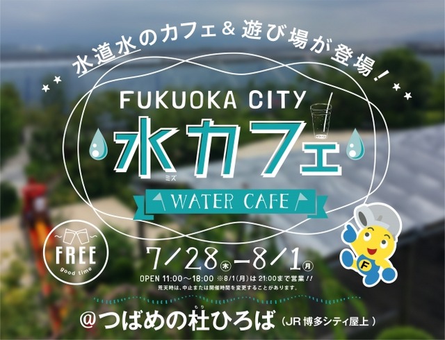 福岡市水道局では平成28年7月28日(木)から8月1日(月)の期間、JR博多シティつばめの杜ひろばにて福岡市の水道水を使ったメニューをおいしく楽しめる「FUKUOKA CITY 水カフェ」をオープンします。「安全」で「おいしい」福岡市の水道水を、眺めの良い博多駅屋上ひろばでお楽しみください。お子さまには、簡単ろ過装置づくりや、利き水体験など水にまつわる実験や工作も体験していただけるキッズ遊び場がおすすめです。