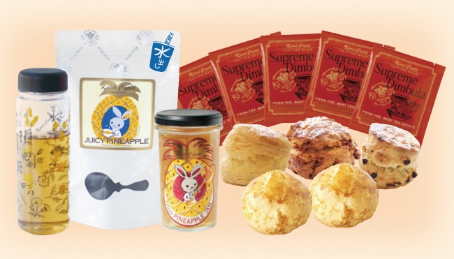 7月は定番の3種類に加えて「ココナッツパインスコーン」を詰め合わせ、水出し紅茶とセイロンティーの優等生・ディンブラのティーバッグ、セイロンパイナップルジャムもついた豪華セット!(スコーン10個入り:4,536円、5個入り:3,456円)