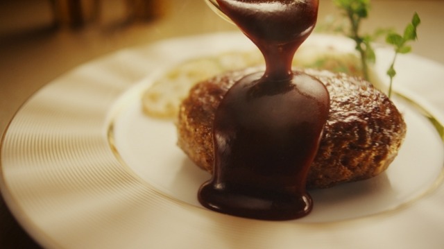 ■こだわりの濃厚デミグラスソースをたっぷりかけ、テーブルにサーブ。
