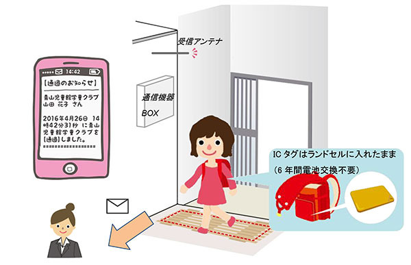 セミアクティブICタグを持ったお子さまが学童クラブの出入口(小学校内にある学童クラブの場合は学校門)を通過すると、保護者の方にメールが配信されるサービスです。