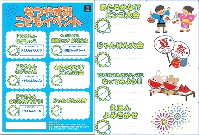 「夏のキャンペーンの一環として、7月23日より、全国のTSUTAYA店舗で実施される「ナツロク」企画を開始いたします。夏休み期間中、小学生以下のお子様を対象に、週替りで最大6回店頭イベントを開催し、「ドラえもんぬりえであそぼう」「縁日イベント」「ドラえもんさがしっこ」「キャラクターぬりえであそぼう!」「じゃんけん大会」「えほんよみきかせ会」等、暑い夏をお子様とご家族に楽しんでもらうイベントもご用意しております。イベント実施店舗等の詳細情報は、「TSUTAYAナツロク」特集ページはコチラから↓※実施状況は店舗によりことなりますのでご注意ください。