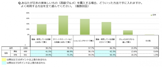 グルメ商品の購入経路を尋ねたところ、「デパートやスーパーなどの店舗に出向いて購入」が70.1%で最も高く、次いで「ショッピングサイトで購入」が57.7%と続く。