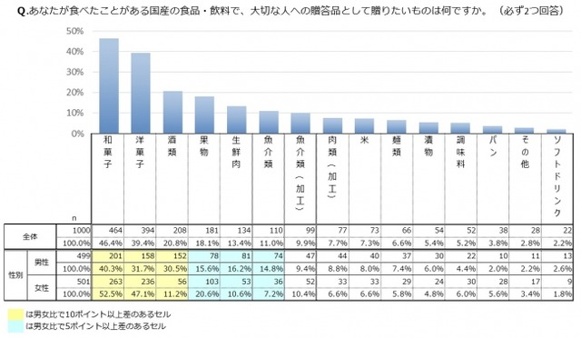 男女別に見てみると、男女とも1位「和菓子」、2位「洋菓子」となったが、3位では、男性は「酒類」(30.5%)、女性は「果物」(20.6%)と嗜好が分かれる結果に。