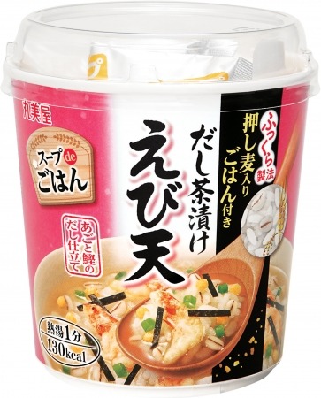 丸美屋食品工業株式会社(本社:東京都杉並区、社長:阿部豊太郎)では、“押し麦入りごはん”が大好評の「スープdeごはん」シリーズより、「スープdeごはん だし茶漬け<えび天>」を2016年8月25日(木)から新発売いたします。また、「スープdeごはん だし茶漬け<さけ>」を2016年8月からリニューアル発売いたします。