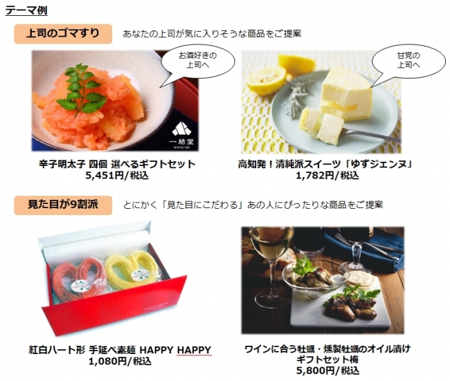 「おくりものソムリエ」では、贈る相手についての情報から最適な商品を提案するのに加え、あらかじめご用意したテーマをお選びいただく「ソムリエ勝手にセレクション」のラインナップもご用意しております。