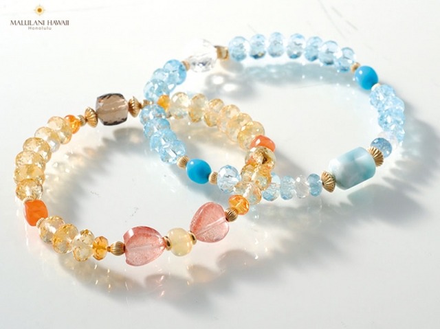 希少な天然石の美しさを、エレガントに仕立てた新作は、ハワイの真っ青な空、降り注ぐ光をイメージした、歓喜と癒しのブレスレットです。
