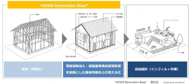 “HOWS Renovation Base” とは、中古戸建てのリノベーションを行う上で不安要素となりやすい「構造」や「劣化」に関して、当社が既存建物の躯体性能の見える化・向上の提案を行い、その改修を前提に販売を行うことで、購入者が、安心して自由設計(インフィルや外構等)を楽しめるベースとなるハコを提供するサービスです。マンションと比較して、改修範囲や改修費用が分かりづらい躯体性能部分に対する不安が解消されることで、これまでハードルが高かった戸建てリノベーションが身近になり、中古戸建て流通の促進に繋がると考えております。
