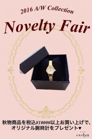 「evelyn」は、秋物商品の販売に向け、2016 秋冬 Collection Novelty Fairを7月23日(土)より開催します。秋物商品を10,000円(税込)以上お買い上げのお客様の方にはオリジナルノベルティとしてオリジナルウォッチをプレゼントします。華奢で上品な時計なので、華やかな手元を彩ってくれるアイテムとなっています。