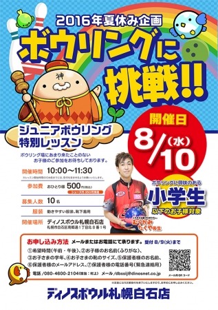 ィノスボウル札幌白石店において、8 月 10 日(水)に小学生以下を対象とした夏休み企