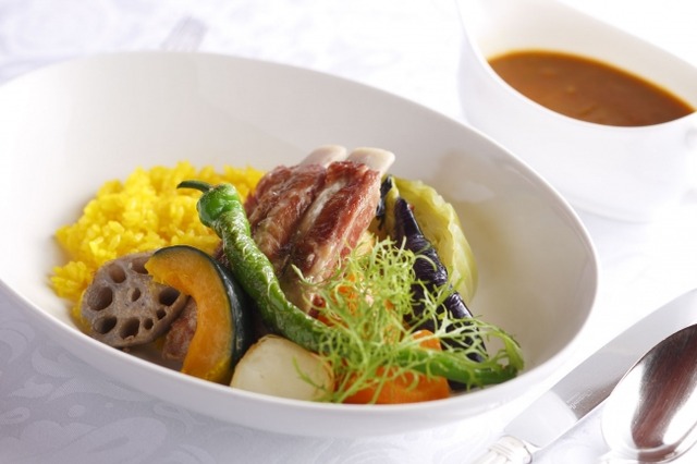 うまみが凝縮された塩漬けのイベリコ豚を、ほろほろとほどけるかのようにやわらかく煮込み、色鮮やかな夏野菜と合せました。香り高いスパイスを感じるカレーソースは辛すぎずさっぱりとした味わいです。