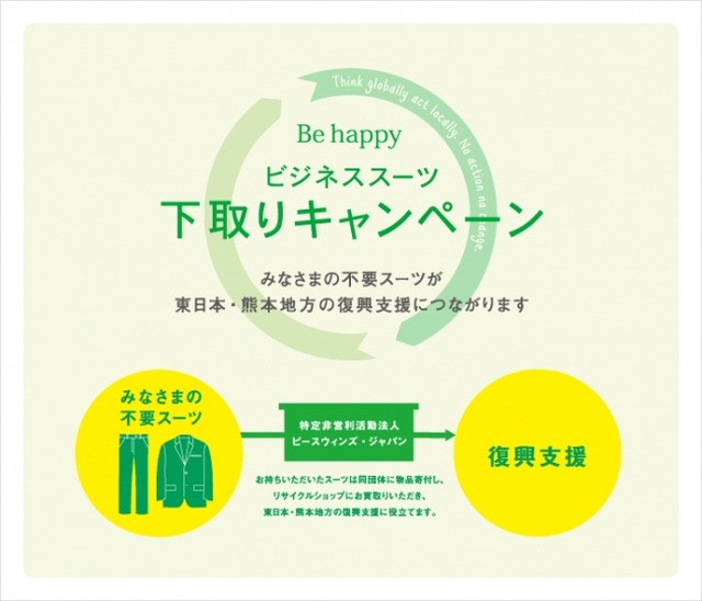 ブランド問わず、ご不要になったメンズ・ウィメンズのビジネススーツ(上下セット)をGLR店舗にお持ちいただくと、1セットにつき“対象のスーツ・ジャケット・シューズ・バッグ10%OFF”もしくは、東日本大震災と平成28年熊本地震の被災地復興支援のために、“当社より特定非営利活動法人ピースウィンズ・ジャパン(*2)(以下、PWJ)に300円寄付”のいずれかをお選びいただけます。