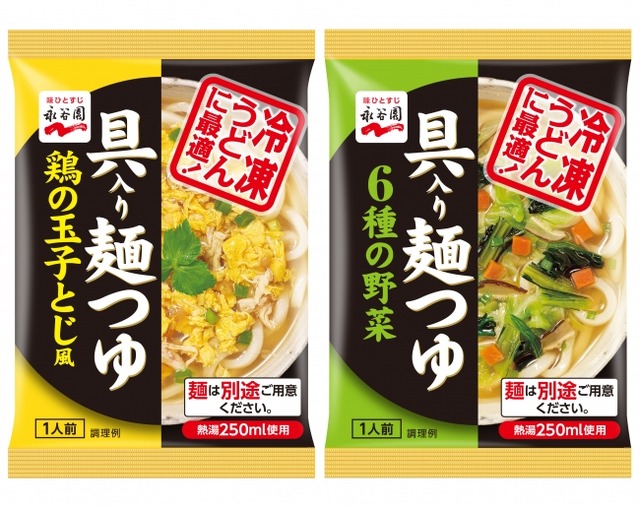 株式会社 永谷園(社長:飯塚 弦二朗、東京都港区)は、フリーズドライ(真空凍結乾燥、以下FD)製法ならではの具材がたっぷり入ったFDブロックタイプ商品「具入り麺つゆ 鶏の玉子とじ風」「同 6種の野菜」(税抜190円)を、2016年8月22日(月)より全国で発売いたします。お湯を注ぐだけで、大きな具材が入った麺つゆがすぐに出来上がるので、冷凍うどん等と合わせれば、麺メニューが簡単に火を使わずに調理できます。冷凍うどん売場等との関連販売も提案し、FDブロック市場の更なる活性化を図ってまいります。