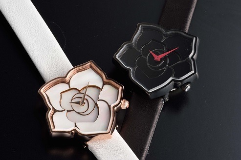 「EGLANT」は、繊細なバラの花びらをデザインした女性向けの腕時計です。商品名は、原種のバラの1種「Rosa Eglanteria」に因んでいます。左右非対称のデザインや文字盤の2段構造、リューズにあしらわれたダイヤモンドなど、随所に女性を美しく見せるための工夫がなされています。「EGLANT」には5種類あります。レッドとブラックの文字盤にはブラックのケース、マザーオブパールの文字盤にはシルバー、ゴールド、ピンクゴールドのケースを用意しております。ベルトはブラック、とホワイトの2種類です。