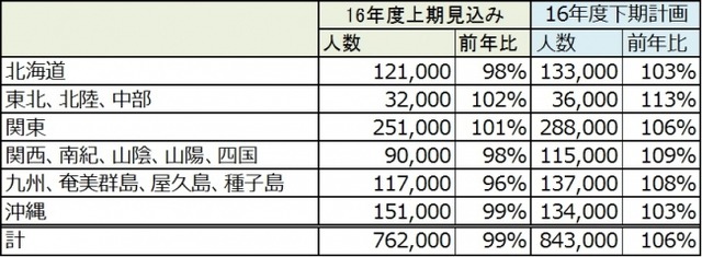 16年度上期は、JALダイナミックパッケージの伸長を見込むも、4月に発生した熊本震災によるキャンセルと新規予約の鈍化、およびゴールデンウィーク期間が低調に推移した影響等により762,000人(前年比99%)となる見通しです。16年度下期は、震災影響による需要低迷に加え、旺盛な訪日需要に起因する仕入れ環境の競争激化など厳しい状況が続く見込みですが、各種商品・施策のタイムリーな投入やJALダイナミックパッケージの体制強化等に取り組み、安心で高品質な「JALパックならでは」の商品を提供していきます。