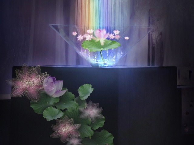 デジタルと自然を融合した「花」のアートイベント“FLOWERS BY NAKED”。ホログラムに映し出される雨上がりの虹とともに、『ローパ ケンゾー』の香りとロータスのイメージが出現します。