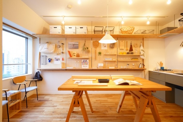オーナー負担で、壁一面に有孔ボードを設置。入居者のアイディアで、東急ハンズでアイテムをそろえながら、自分だけの収納をつくったり、思い思いに飾ったり、楽しむことができます。