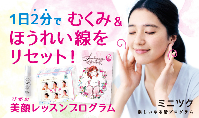 株式会社フェリシモ(神戸市中央区)は、おうちレッスンプログラム「ミニツク」の新プログラムとして、「1日2分 美顔レッスンプログラム」の販売を2016年7月15日(金)よりスタートいたしました。むくみやほうれい線が気になるけれども、エステに通う時間や余裕のない女性に向けた、簡単ホームケアプログラムです。プロのエステティシャン直伝のリンパマッサージと本格的なフェイスマッサージを1日2分続けることで、むくみやほうれい線への対策ができ、6ヵ月続けることでセルフメンテナンス習慣が身につきます。http://feli.jp/s/pr160727/1/