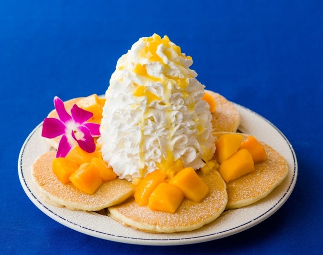 たっぷりと添えられた人気のマンゴーや、エアーチーズケーキに相性抜群のマンゴーパッションソースをかけ、見た目も華やかに仕上げた今回だけの特別なパンケーキをぜひお店でお楽しみください。