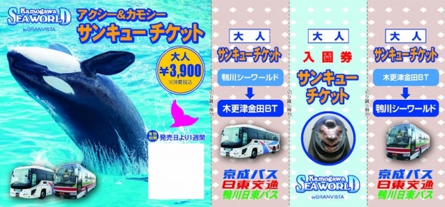 株式会社グランビスタ ホテル&リゾート(本社:東京都中央区、代表取締役社長:須田貞則)の基幹施設である、鴨川シーワールド(千葉県鴨川市、館長:勝俣浩)では、京成バス株式会社(本社:千葉県市川市、社長:齋藤隆)、日東交通株式会社(本社:千葉県木更津市、社長:片野義雄)、鴨川日東バス株式会社(本社:千葉県鴨川市、社長:鈴木孝男)とコラボレーションし、木更津金田バスターミナルと鴨川シーワールド間(片道所要時間約1時間30分)の「アクシー号」往復乗車券と鴨川シーワールドの入園券がセットで3,900円になる、お得な共通チケット アクシー&カモシー「サンキューチケット」を2016年8月1日(月)より木更津金田バスターミナル「バス案内所」で発売いたします。